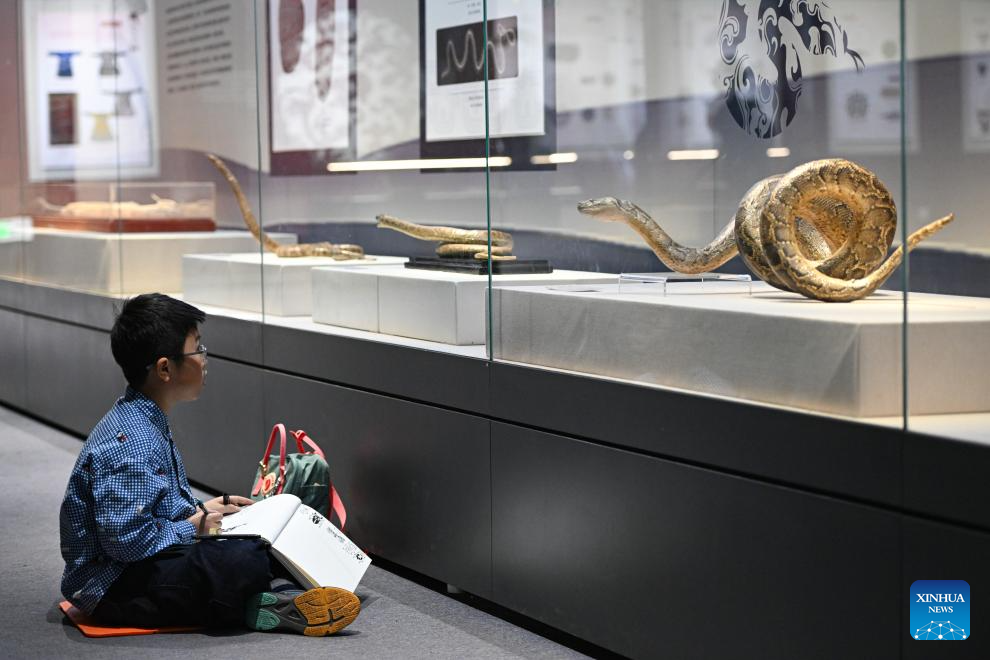 A child draws a sketch of a python specimen at a Chinese zodiac cultural relics joint exhibition for the 2025 Year of the Snake held at the Natural History Museum of China in Beijing, China, Jan. 18, 2025. Some 50 snake specimens and a large number of snake-related cultural relics, handicrafts as well as exhibition panels were on display during the exhibition, showcasing the diverse images and meanings of snakes in the Chinese culture. (Xinhua/Chen Zhonghao)