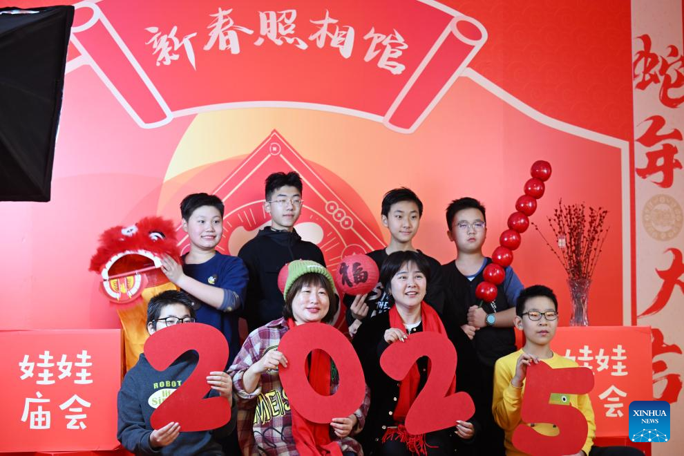Adults and children pose for photos during a children's temple fair at the Youth and Children's Center in north China's Tianjin, Jan. 18, 2025. The three-day children's event kicked off on Saturday in Tianjin to welcome the Chinese Lunar New Year by showcasing intangible cultural heritage folklore, performances and traditional food. (Xinhua/Li Ran)