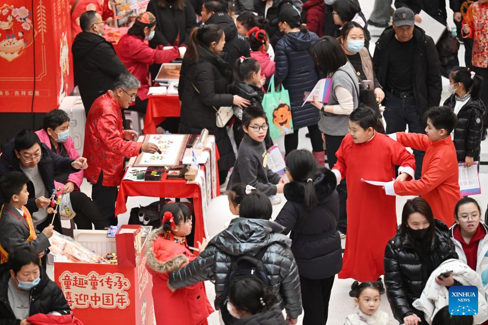 Adults and children attend a children's temple fair at the Youth and Children's Center in north China's Tianjin, Jan. 18, 2025. The three-day children's event kicked off on Saturday in Tianjin to welcome the Chinese Lunar New Year by showcasing intangible cultural heritage folklore, performances and traditional food. (Xinhua/Li Ran)
