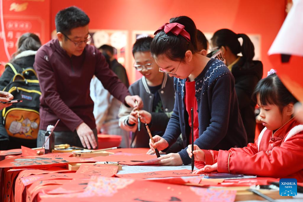 Children write Spring Festival couplets during a children's temple fair at the Youth and Children's Center in north China's Tianjin, Jan. 18, 2025. The three-day children's event kicked off on Saturday in Tianjin to welcome the Chinese Lunar New Year by showcasing intangible cultural heritage folklore, performances and traditional food. (Xinhua/Li Ran)