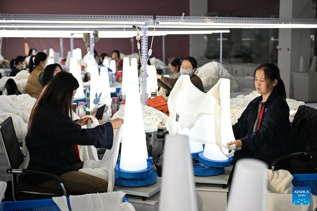 Staff members examine the quality of cashmere clothes at a cashmere products manufacturer in Qinghe County, Xingtai City, north China's Hebei Province, Jan. 18, 2025. Cashmere products manufacturers in Qinghe County are busy with production for orders before the upcoming Spring Festival holidays. Qinghe County is a renowned cashmere raw material processing and distribution center, cashmere spinning base and an important production and marketing base of cashmere products in China. (Xinhua/Mu Yu)