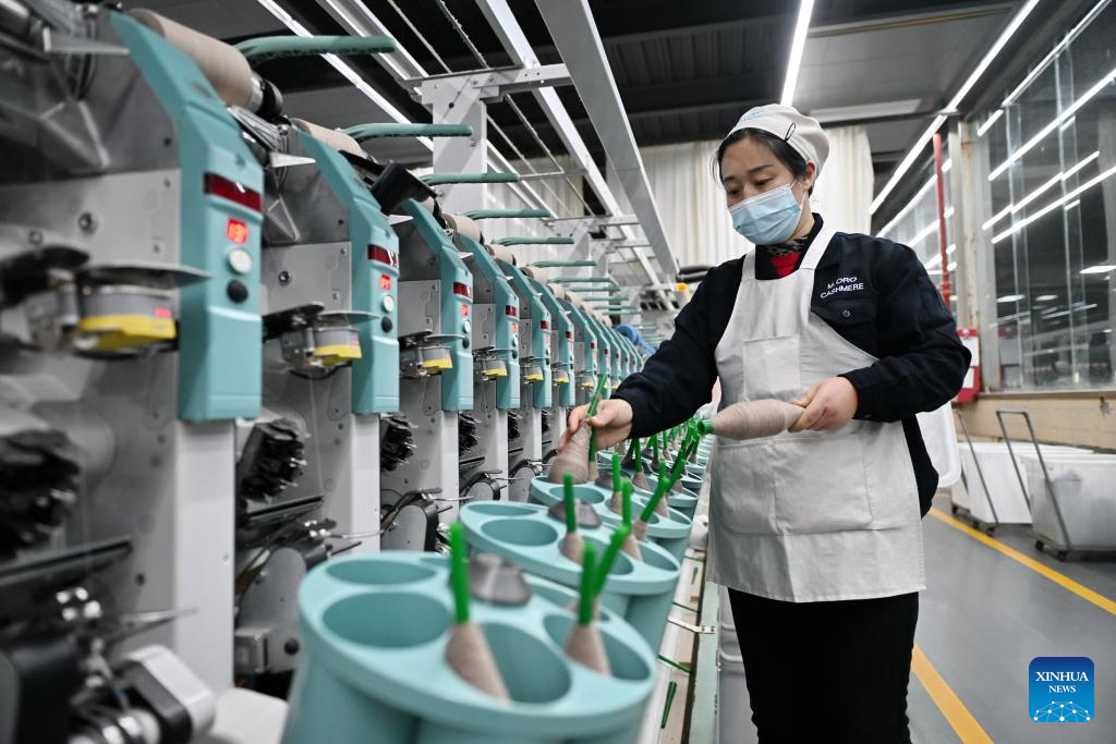 A staff member works at the cashmere yarn production workshop of a cashmere products manufacturer in Qinghe County, Xingtai City, north China's Hebei Province, Jan. 18, 2025. Cashmere products manufacturers in Qinghe County are busy with production for orders before the upcoming Spring Festival holidays. Qinghe County is a renowned cashmere raw material processing and distribution center, cashmere spinning base and an important production and marketing base of cashmere products in China. (Xinhua/Mu Yu)