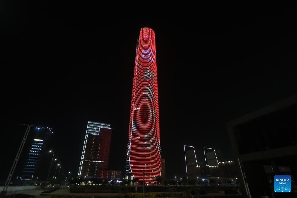 This photo taken on Jan. 19, 2025 shows the Iconic Tower decorated in a festive LED illumination ahead of the Chinese Lunar New Year at the Central Business District (CBD) in the new administrative capital of Egypt. (Xinhua/Sui Xiankai)