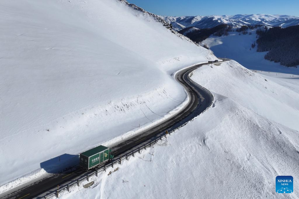 The truck Mukhametbek Mukhamethali drives is pictured on the way to Hemu Village in Altay Prefecture, northwest China's Xinjiang Uygur Autonomous Region, Jan. 2, 2025. (Xinhua/Yin Xingyu)
