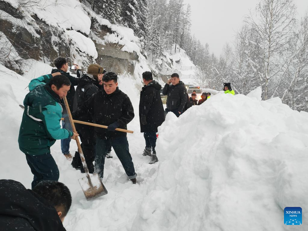 Mukhametbek Mukhamethali (1st L) helps remove snow from the road on his way back in Burqin County in Altay Prefecture, northwest China's Xinjiang Uygur Autonomous Region, Jan. 2, 2025. (Xinhua/Zhang Xiaolong)