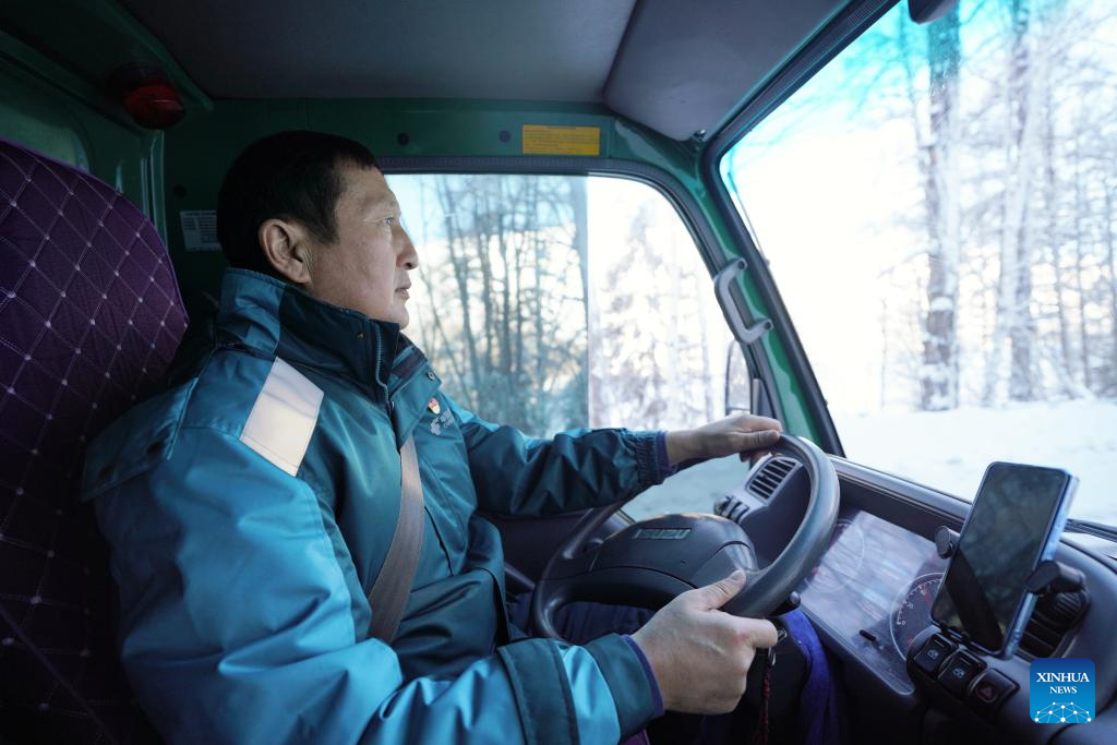 Mukhametbek Mukhamethali leaves for Hemu Village from Burqin County in Altay Prefecture, northwest China's Xinjiang Uygur Autonomous Region, Jan. 6, 2025.  (Xinhua/Aman)