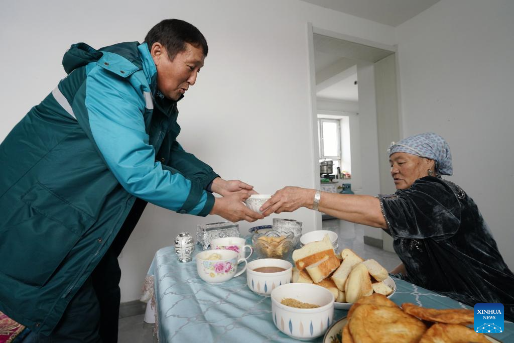A herder serves Mukhametbek Mukhamethali milk tea in Burqin County, Altay Prefecture, northwest China's Xinjiang Uygur Autonomous Region, Jan. 4, 2025.  (Xinhua/Aman)