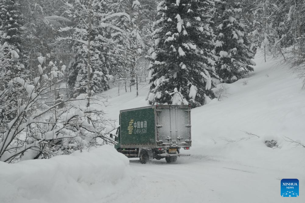 Mukhametbek Mukhamethali unloads packages at Hemu Village, Altay Prefecture, northwest China's Xinjiang Uygur Autonomous Region, Jan. 6, 2025. (Xinhua/Aman)