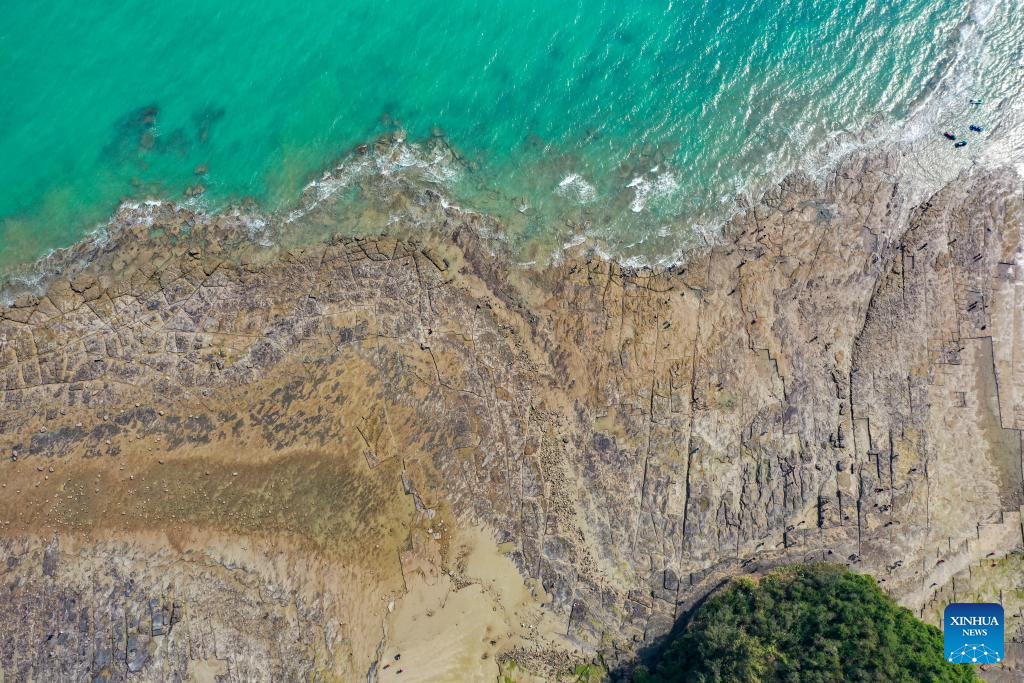 Visitors take photos of rocks at Weizhou Island in south China's Guangxi Zhuang Autonomous Region, Jan. 7, 2025. Weizhou Island, located in the Beibu Gulf, is China's youngest volcanic island. In recent years, the local government has strengthened marine ecological protection and developed infrastructure on the island, making it a popular tourist destination. (Xinhua/Jin Haoyuan)