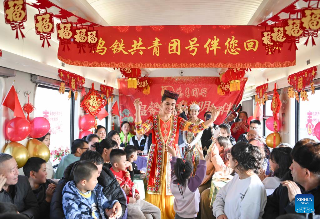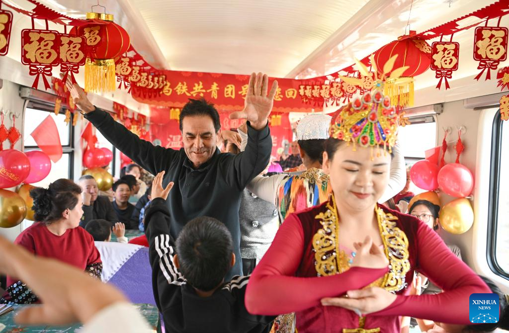 Train conductor Airkir Duliki and passengers attend a Spring Festival gala on the train linking Kashgar of northwest China's Xinjiang Uygur Autonomous Region and Chengdu of southwest China's Sichuan Province, Jan. 16, 2025. (Xinhua/Hu Huhu)