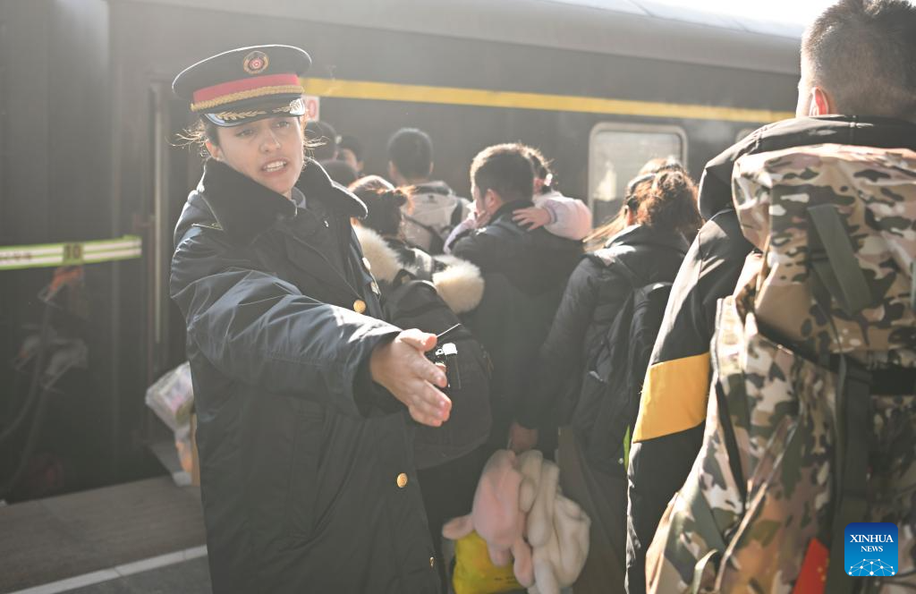 Train conductor Airkir Duliki guides passengers to board the train orderly at a train station along the railway route linking Kashgar of northwest China's Xinjiang Uygur Autonomous Region and Chengdu of southwest China's Sichuan Province, on Jan. 16, 2025. (Xinhua/Hu Huhu)