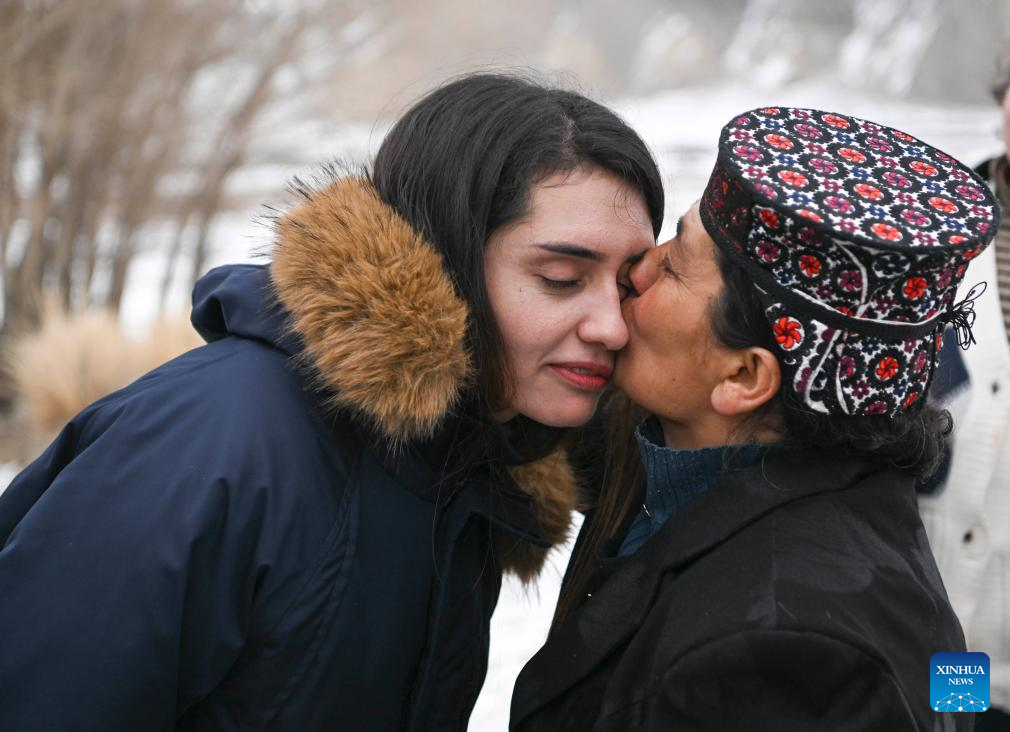 Airkir Duliki's mother kisses her goodbye before Duliki leaves home in Xiabuzikla Village of Waqa County, Taxkorgan Tajik Autonomous County, northwest China's Xinjiang Uygur Autonomous Region, Jan. 4, 2025. (Xinhua/Hu Huhu)
