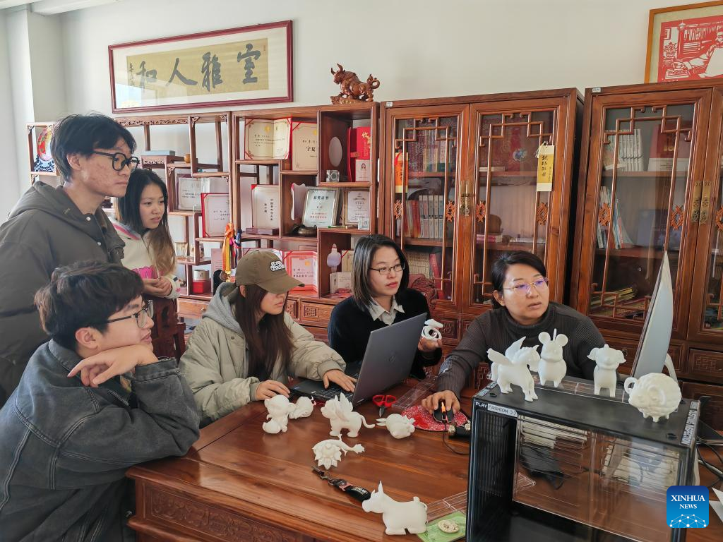 Li Jian (2nd R) and Chen Ling (1st R) work on optimizing the three-dimensional paper-cutting models based on the Chinese zodiac animals in Yinchuan, northwest China's Ningxia Hui Autonomous Region, Jan. 7, 2025. (Xinhua/Liu Hai)