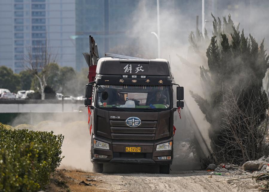 CANGZHOU, Jan. 22 -- On regular days, truck driver Kong Lingjian and his wife Wang Yanqing mainly transport goods between Hangzhou of east China's Zhejiang Province and the areas around Wuhan of central China's Hubei Province. To save expenses, they live in their truck year-round. For the couple, the truck is their second home.