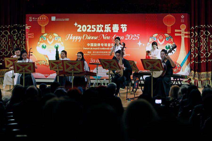Musicians play a tune at the "2025 Happy Spring Festival" Chinese traditional music concert at the Romanian Athenaeum in Bucharest, capital of Romania, Jan. 20, 2025. (Photo by Cristian Cristel/Xinhua)