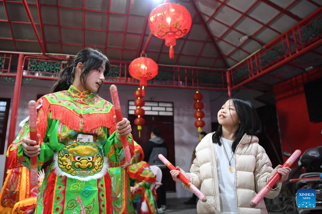 A member of an Yingge dance troupe demonstrates dance movements to a girl in Chaoyang District of Shantou City, south China's Guangdong Province, Jan. 20, 2025. Local Yingge dance troupes have been busy in rehearsing for performances to greet the upcoming Chinese New Year. The Yingge dance, or "dance to the hero's song," merges opera, dance, and martial arts. Dating back to the Ming Dynasty (1368-1644), this traditional dance is often performed during traditional Chinese festivals. The Yingge dance was listed as the first batch of national intangible cultural heritage in 2006. (Xinhua/Deng Hua)