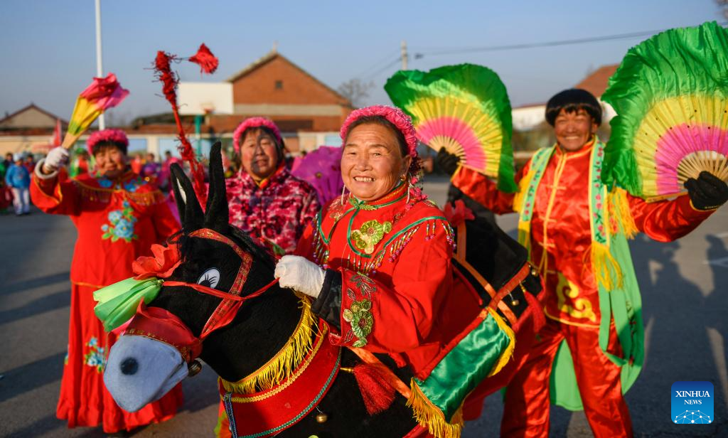 Folk artists perform at Xixiaying Manchu Township in Zunhua, north China's Hebei Province, Jan. 22, 2025. As the 2025 Chinese New Year will fall on Jan. 29, excitement is palpable everywhere in China. The Chinese people immerse themselves in traditional customs and partake in the festivities. The Chinese New Year, or the Spring Festival, falls on next Wednesday, marking the beginning of the Year of the Snake. (Photo by Liu Mancang/Xinhua)