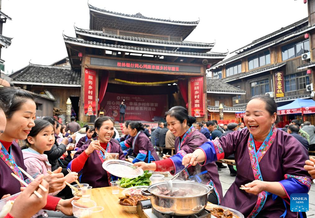 Local villagers enjoy New Year feast at Pingyan Village of Sanjiang Dong Autonomous County, south China's Guangxi Zhuang Autonomous Region, Jan. 22, 2025. As the 2025 Chinese New Year will fall on Jan. 29, excitement is palpable everywhere in China. The Chinese people immerse themselves in traditional customs and partake in the festivities. The Chinese New Year, or the Spring Festival, falls on next Wednesday, marking the beginning of the Year of the Snake. (Photo by Li Hanchi/Xinhua)