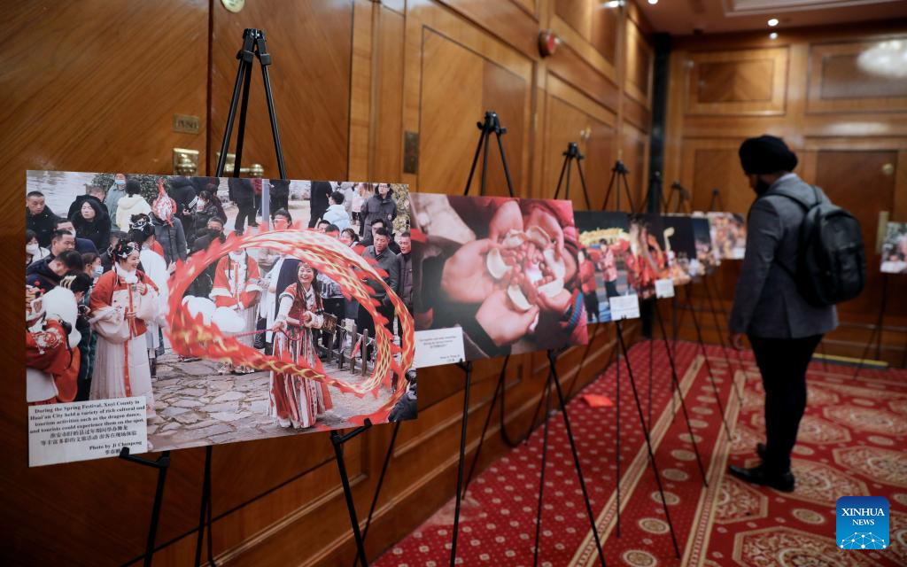 A man visits a photography exhibition during "Happy Chinese New Year - Charm of Jiangsu" Cultural and Tourism Promotion, held in London, Britain, Jan. 21, 2025. (Xinhua/Li Ying)