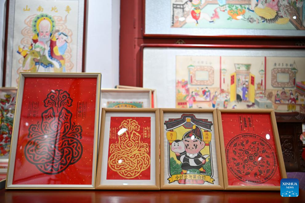 With the approaching of the lunar new year, a series of cultural and creative products carrying the Yangliuqing woodblock new year pictures have been created under the inspiration of the Year of the Snake. (Xinhua/Sun Fanyue)