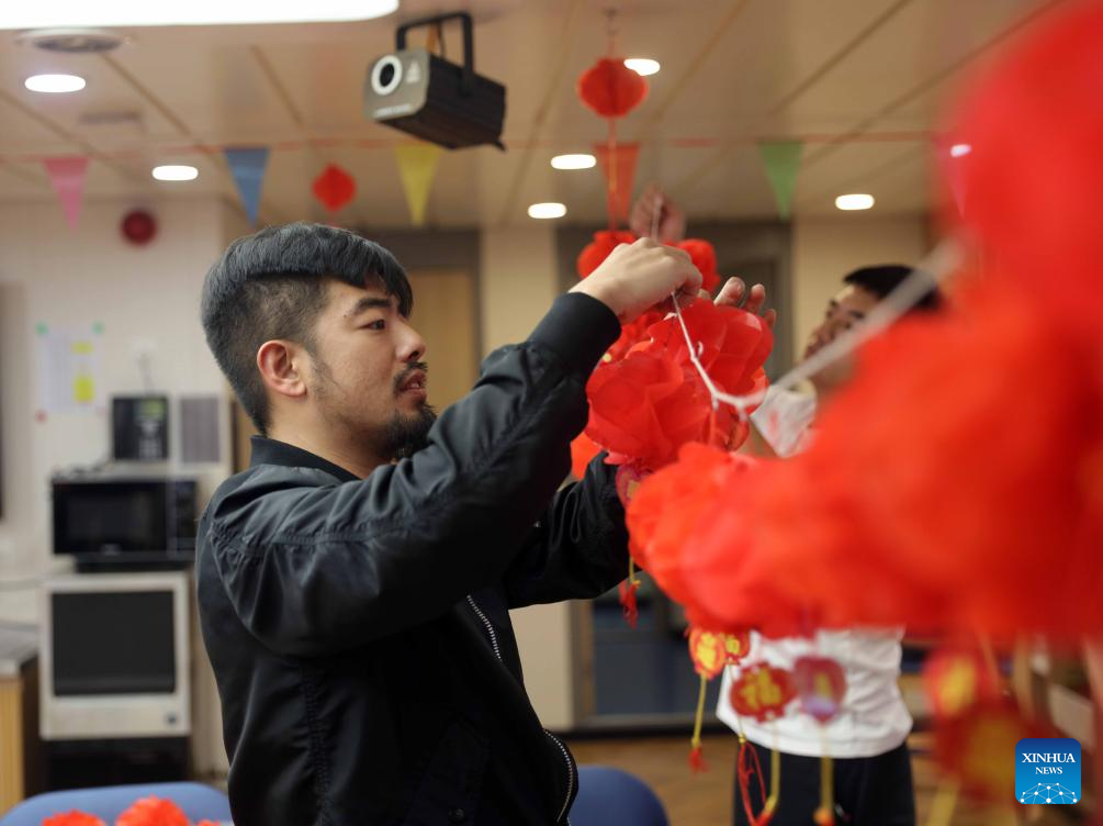 Members of China's 41st Antarctic expedition team decorate the dining hall on Chinese research icebreaker Xuelong 2, Jan. 23, 2025. Chinese research icebreaker Xuelong 2, or Snow Dragon 2, is conducting a month-long marine ecosystem survey in the Amundsen Sea, which include a comprehensive investigation and monitoring of biological ecology, water, sedimentary and atmospheric environment, and pollutant distribution. Members of the expedition team decorated the vessel to greet the upcoming Spring Festival. (Xinhua/Huang Taoming)