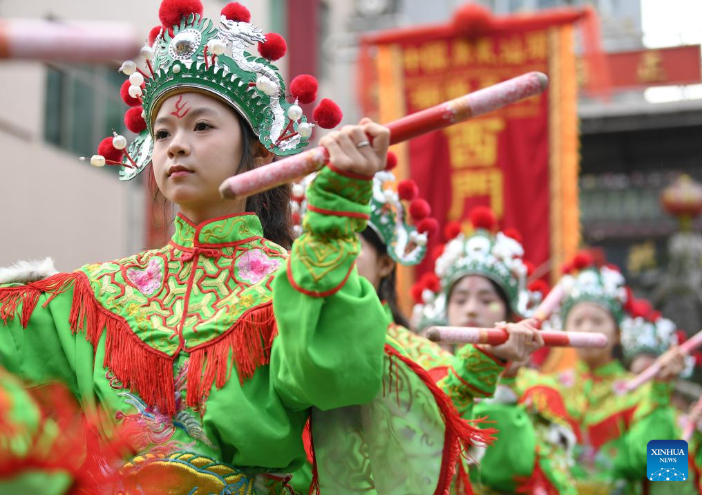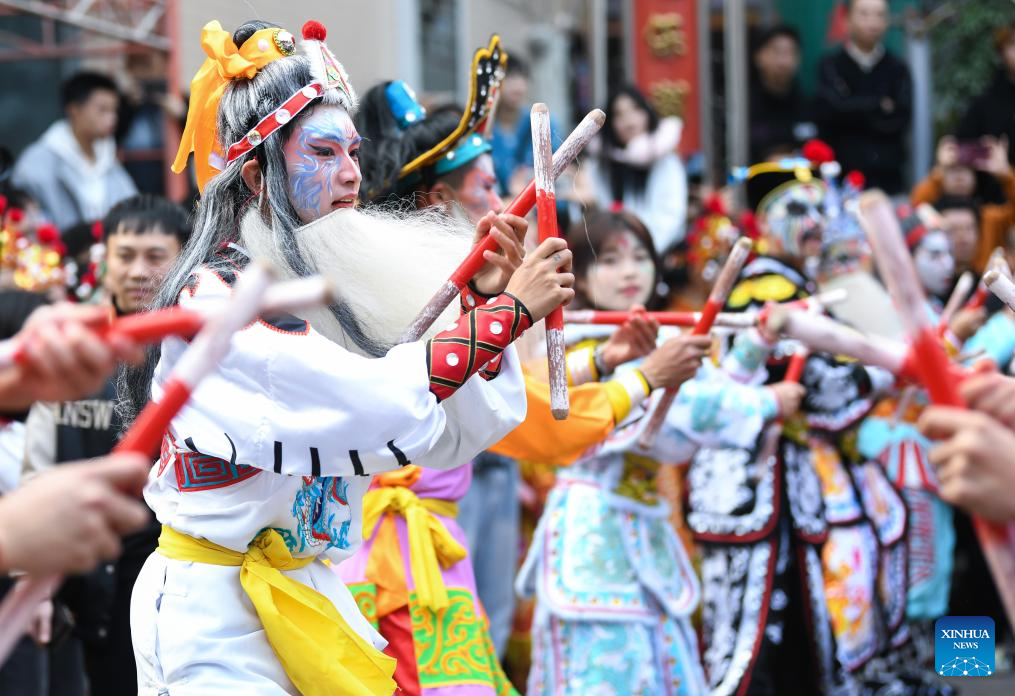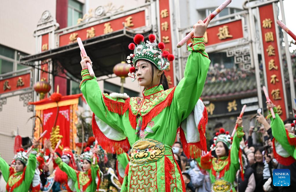 Members of a Yingge dance troupe stage a performance in Chaoyang District of Shantou City, south China's Guangdong Province, Jan. 23, 2025. The traditional Chinese Xiaonian festival is observed in south China on Thursday. In Shantou City, local Yingge dance troupes performed on the streets to mark the festival and greet the upcoming Chinese New Year.