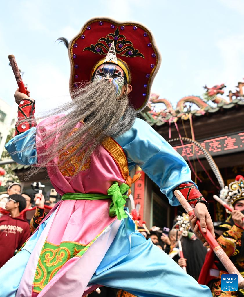 A member of a Yingge dance troupe performs on a street in Chaoyang District of Shantou City, south China's Guangdong Province, Jan. 23, 2025. The traditional Chinese Xiaonian festival is observed in south China on Thursday. In Shantou City, local Yingge dance troupes performed on the streets to mark the festival and greet the upcoming Chinese New Year.