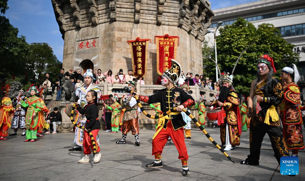 Members of a Yingge dance troupe stage a performance in front of the Wenguang tower in Chaoyang District of Shantou City, south China's Guangdong Province, Jan. 23, 2025. The traditional Chinese Xiaonian festival is observed in south China on Thursday. In Shantou City, local Yingge dance troupes performed on the streets to mark the festival and greet the upcoming Chinese New Year.