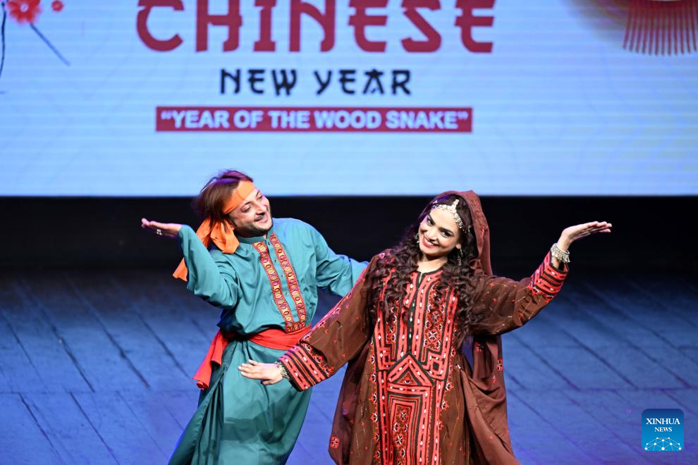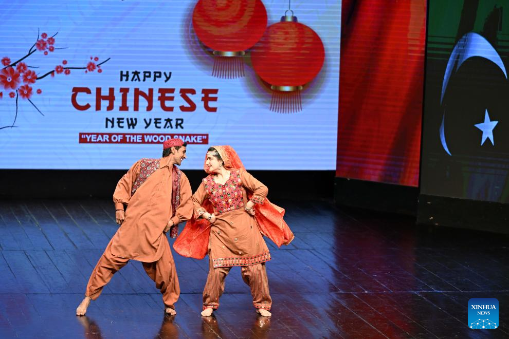 Chinese and Pakistani artists perform during an event to celebrate the upcoming Chinese New Year in Islamabad, capital of Pakistan, on Jan. 22, 2025. The event features vibrant traditional dances by both Chinese and Pakistani performers, showcasing the rich cultural heritage of the two nations. (Xinhua/Ahmad Kamal)