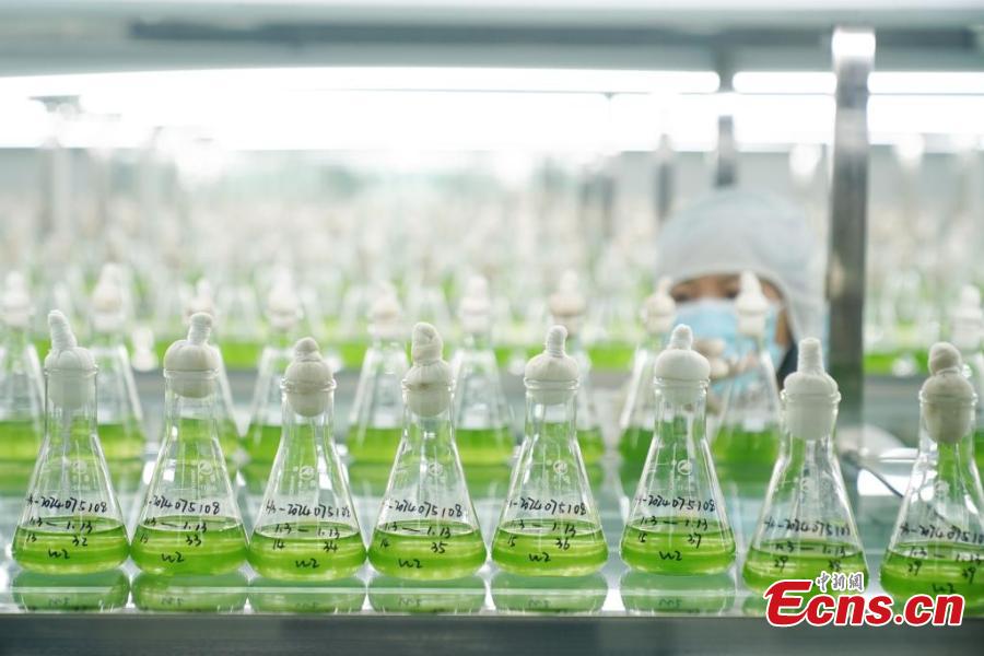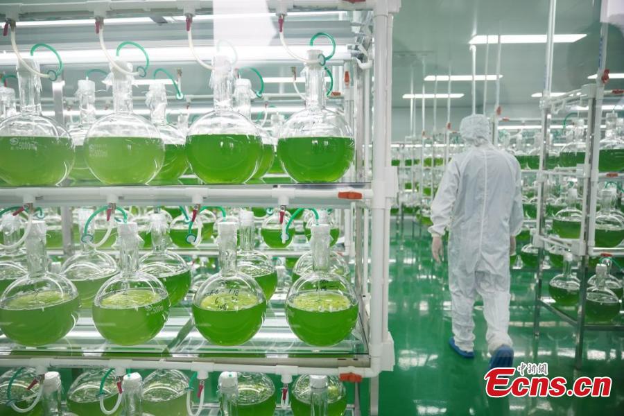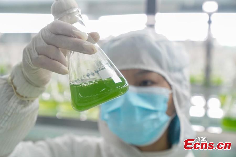 Scientists work at the world's largest astaxanthin production base in Pingbian County, Honghe Prefecture, southwest China's Yunnan Province, Jan. 23, 2025. (China News Service/Liu Ranyang)