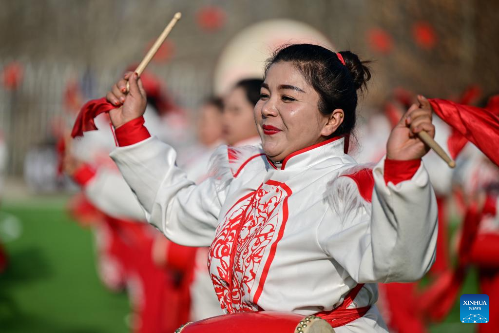 Residents perform Ansai waist-drum, a traditional drum dance, during a "village gala" in Shache County of Kashgar, northwest China's Xinjiang Uygur Autonomous Region, Jan. 22, 2025.