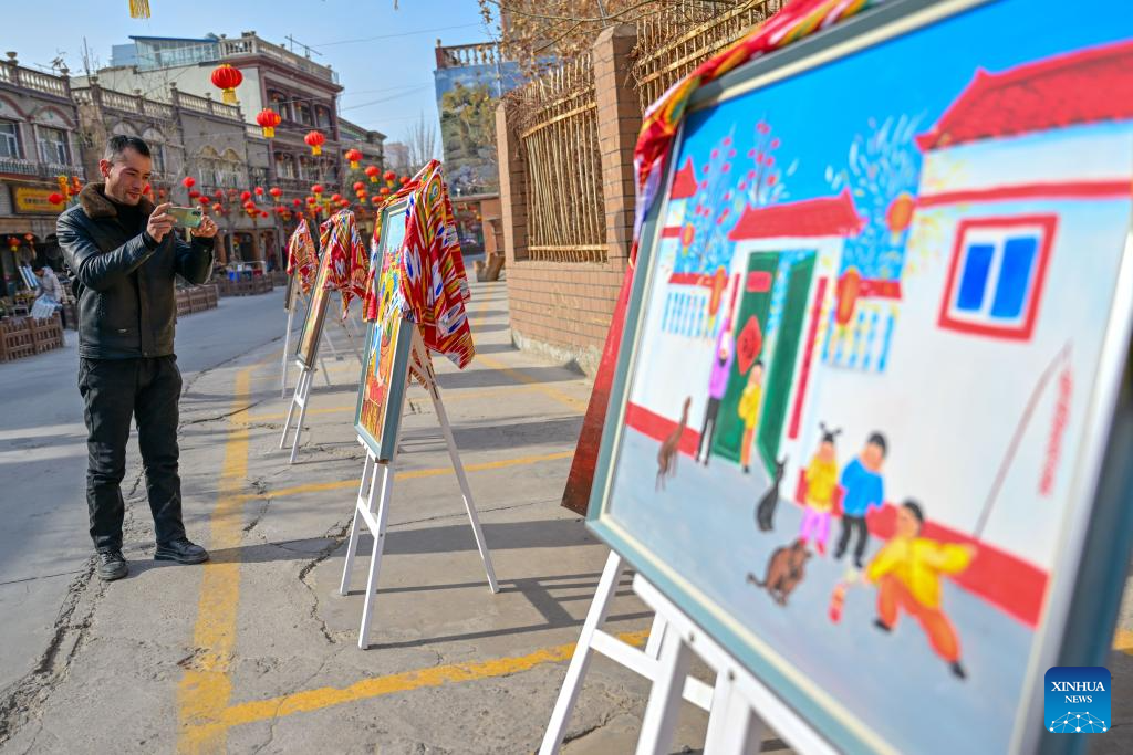 A resident takes photos of farmers' paintings on display as part of a "village gala" in Shache County of Kashgar, northwest China's Xinjiang Uygur Autonomous Region, Jan. 22, 2025.
