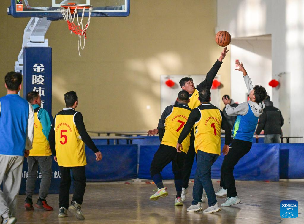 People play a basketball game as part of a "village gala" in Shache County of Kashgar, northwest China's Xinjiang Uygur Autonomous Region, Jan. 23, 2025.