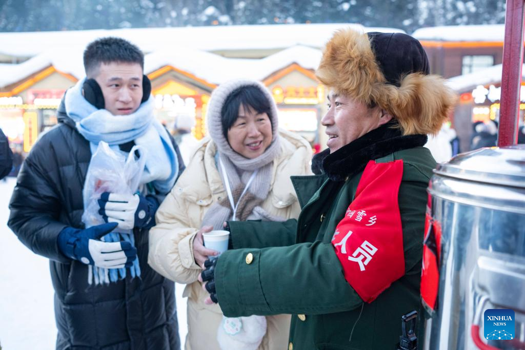 People get free hot ginger soup at China's "Snow Town" scenic spot in Mudanjiang, northeast China's Heilongjiang Province, Jan. 24, 2025.