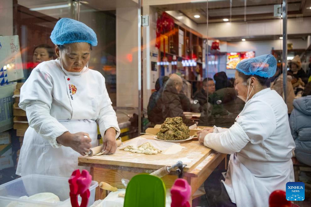 Staff members make dumplings at a restaurant at China's "Snow Town" scenic spot in Mudanjiang, northeast China's Heilongjiang Province, Jan. 24, 2025.