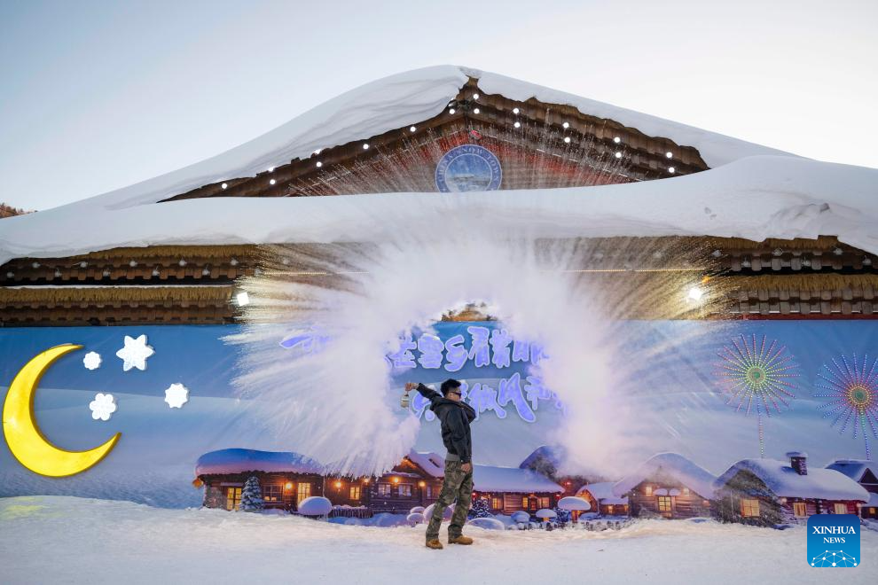 A visitor throws hot water into the air at China's "Snow Town" scenic spot in Mudanjiang, northeast China's Heilongjiang Province, Jan. 24, 2025.
