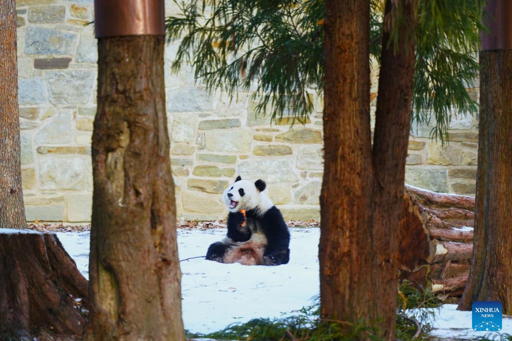 Giant panda Qing Bao eats a carrot at the Smithsonian's National Zoo in Washington, D.C., the United States, Jan. 24, 2025. The giant panda couple, Bao Li and Qing Bao, made their first public appearance on Friday since their arrival at the Smithsonian's National Zoo here. Sent as part of a 10-year international giant panda protection cooperation program, the three-year-old pandas, Bao Li, male, and Qing Bao, female, departed their hometown in Sichuan Province and arrived in the U.S. capital city on Oct. 15, 2024. (Xinhua/Wu Xiaoling)