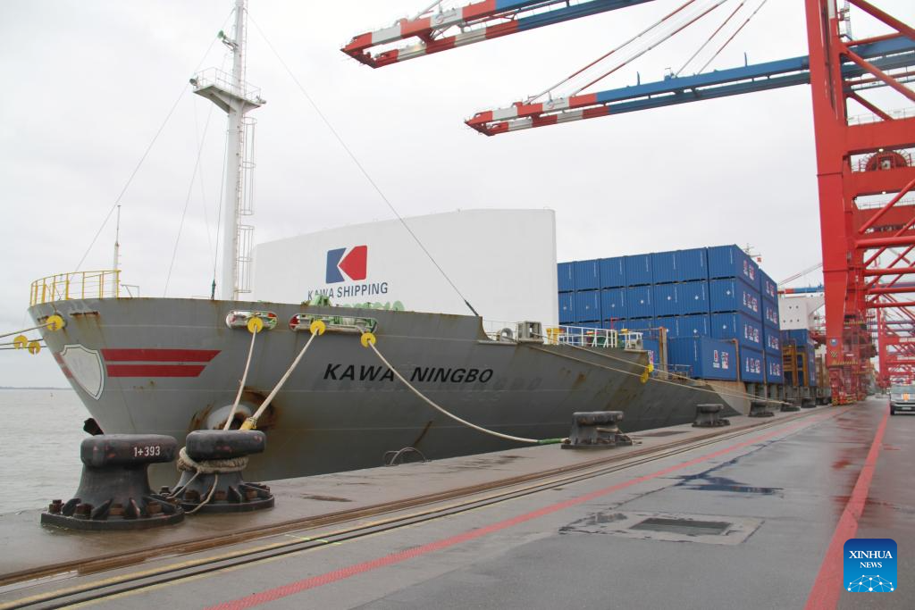 Photo taken on Jan. 24, 2025 shows the "KAWA Ningbo" cargo ship of the "China-Europe Express" in Wilhelmshaven, Germany. The first container ship of the "China-Europe Express", the fastest direct route connecting Europe and China's Yangtze River Delta region, arrived at its destination at the Jade Weser Port in Wilhelmshaven on Friday. The "KAWA Ningbo" cargo ship, carrying over 1700 containers of new-energy and other high-value goods, completed its non-stop voyage in 26 days, well below the shipment time of 45 days in the past. (Xinhua/Shan Weiyi)