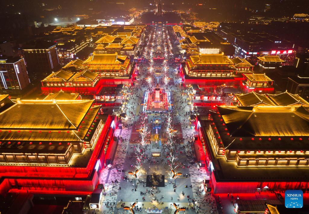 An aerial drone photo shows people visiting the Datang Everbright City scenic area in Xi'an, northwest China's Shaanxi Province, Jan. 22, 2025. As the Spring Festival approaches, Xi'an, one of the ancient capitals in Chinese history, is brimming with bright lights and splendid festive atmosphere. (Xinhua/Shao Rui)