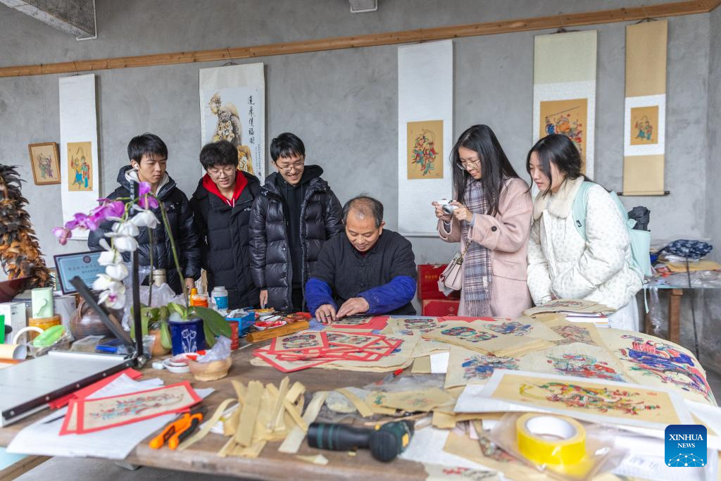 College students watch Xu Jiahui (3rd R) making Liangping New Year Woodblock Prints in Pingjin Town in Liangping District of southwest China's Chongqing, Jan. 14, 2025. (Xinhua/Huang Wei)