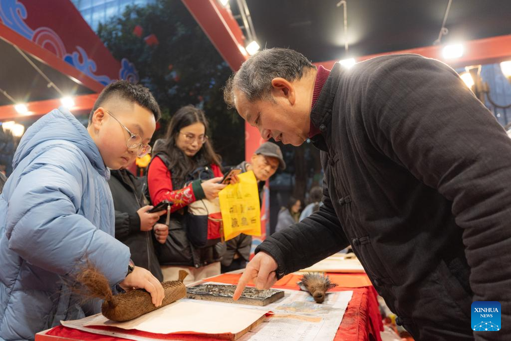 Xu Jiahui (R) instructs a tourist how to make a Liangping New Year woodblock print at a New Year intangible cultural heritage fair in Yuzhong District of southwest China's Chongqing, Jan. 22, 2025. (Xinhua/Huang Wei)