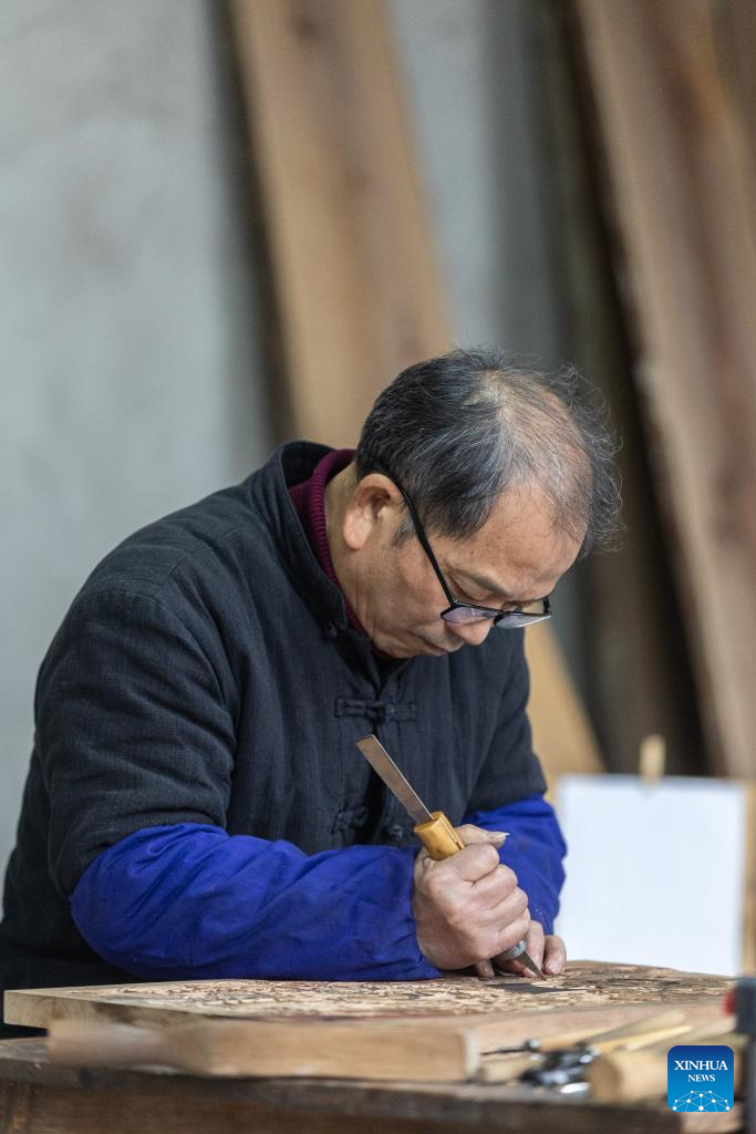 Xu Jiahui carves woodblock at his studio in Pingjin Town in Liangping District of southwest China's Chongqing, Jan. 14, 2025. (Xinhua/Huang Wei)