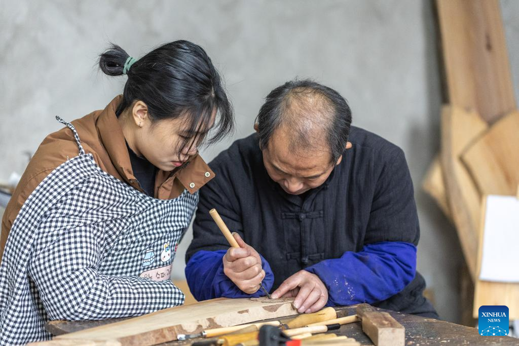 Xu Jiahui (R) instructs a student in woodblock carving at his studio in Pingjin Town in Liangping District of southwest China's Chongqing, Jan. 14, 2025. (Xinhua/Huang Wei)