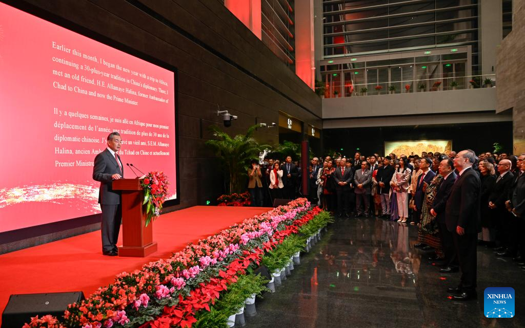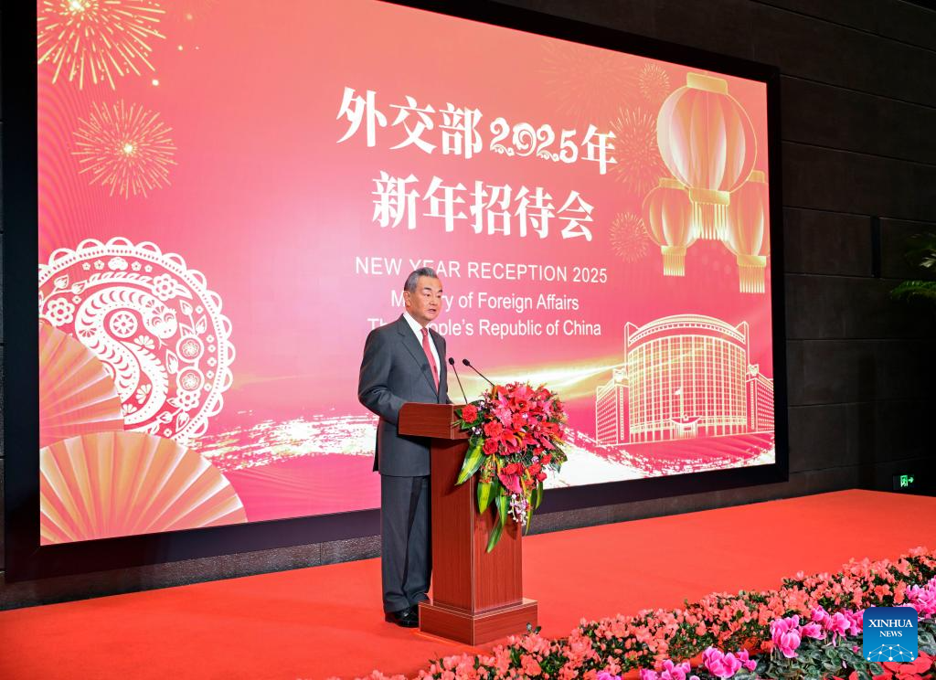Chinese Foreign Minister Wang Yi, also a member of the Political Bureau of the Communist Party of China Central Committee, hosts the Chinese Foreign Ministry's 2025 New Year reception at the Beijing Performing Arts Center in Beijing, capital of China, Jan. 24, 2025. (Xinhua/Yin Bogu)
