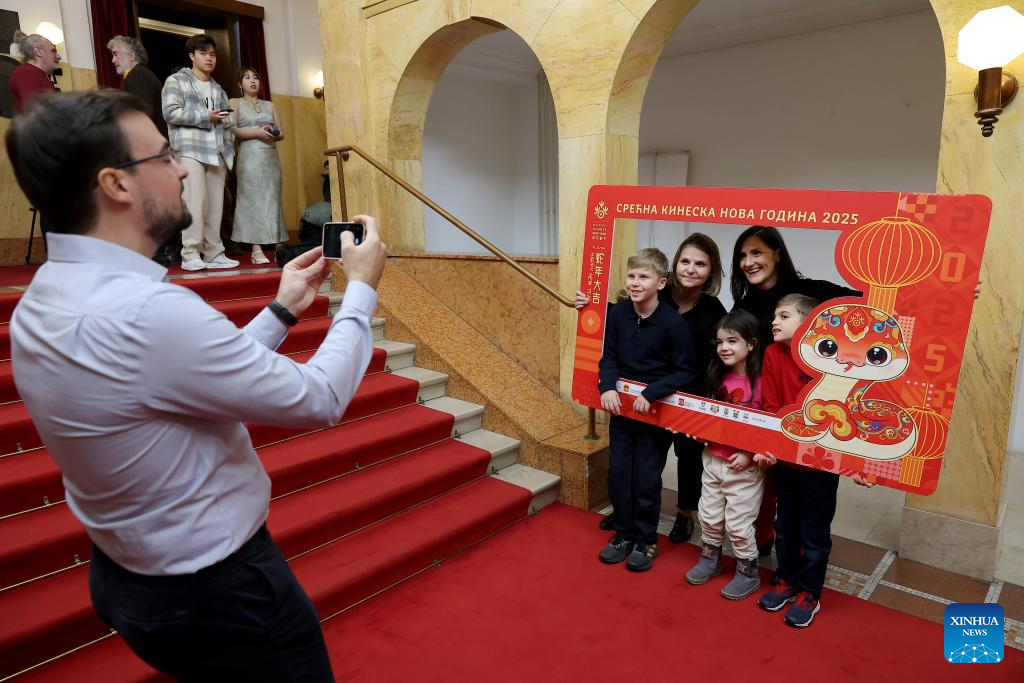 People pose for a photo with a frame to celebrate the upcoming Spring Festival at the Kolarac Concert Hall in Belgrade, Serbia, on Jan. 23, 2025. (Photo by Predrag Milosavljevic/Xinhua)