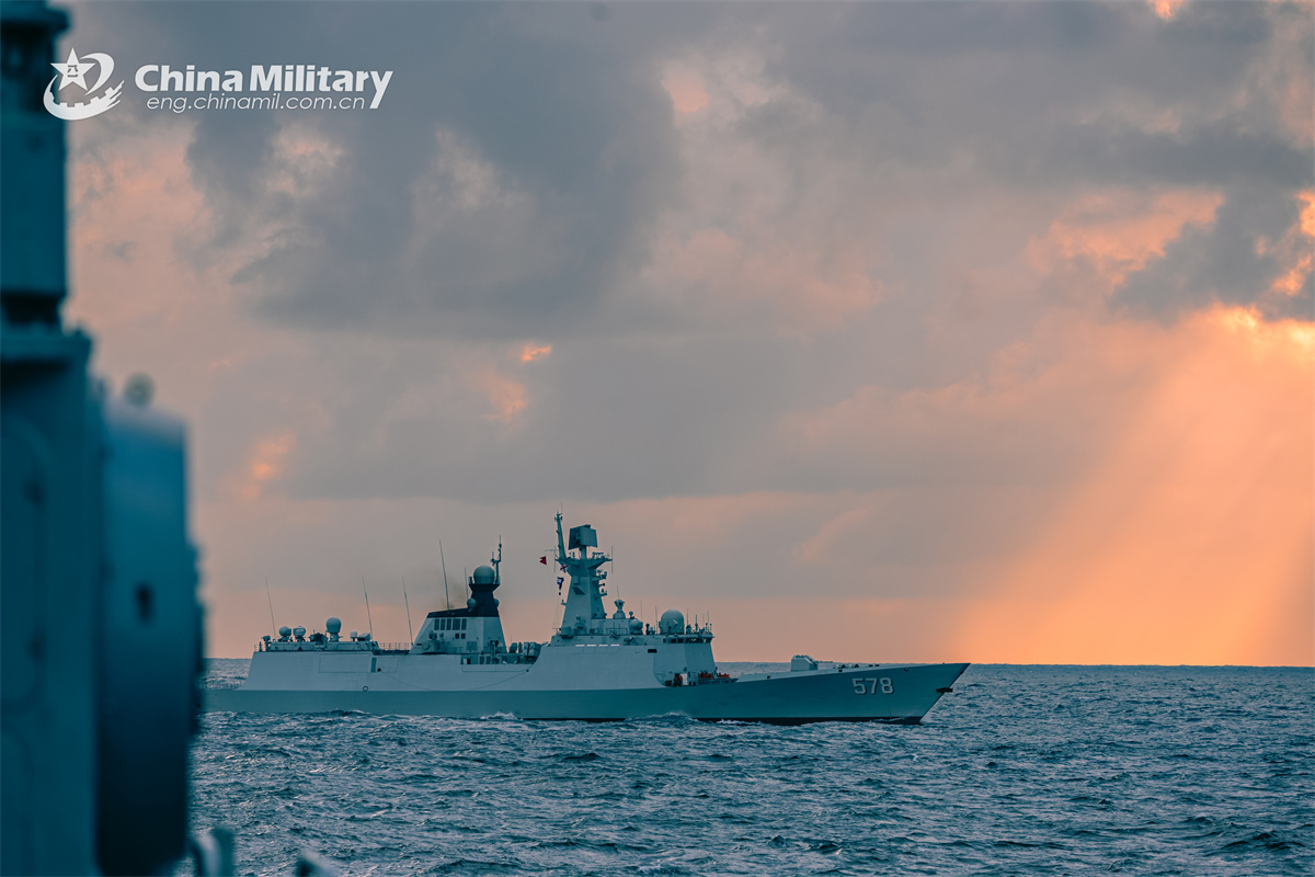 The Type 054A guided-missile frigate Yangzhou (Hull 578) attached to a destroyer flotilla of the navy under the Chinese People's Liberation Army (PLA) Eastern Theater Command sails to the designated sea area during maritime training on December 11, 2024. (eng.chinamil.com.cn/Photo by Wan Haichao)