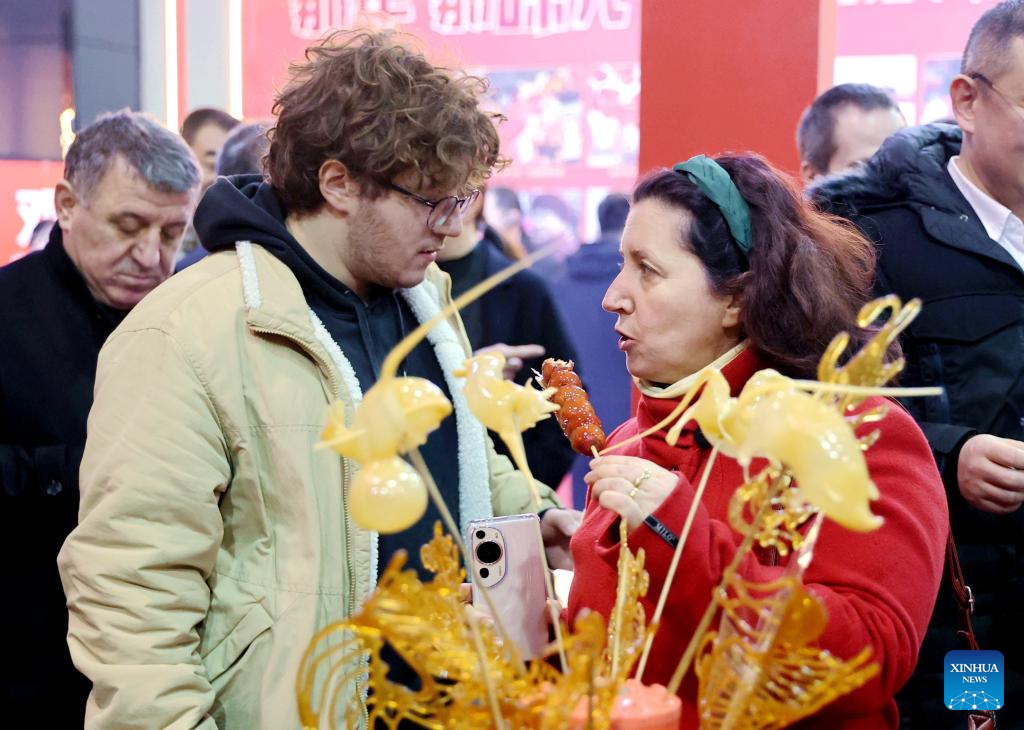 A member of the diplomatic corps tastes sugarcoated haws at a festive event for the upcoming Chinese New Year, or the Spring Festival, in Langfang, north China's Hebei Province, Jan. 23, 2025. (Xinhua/Wang Xiao)