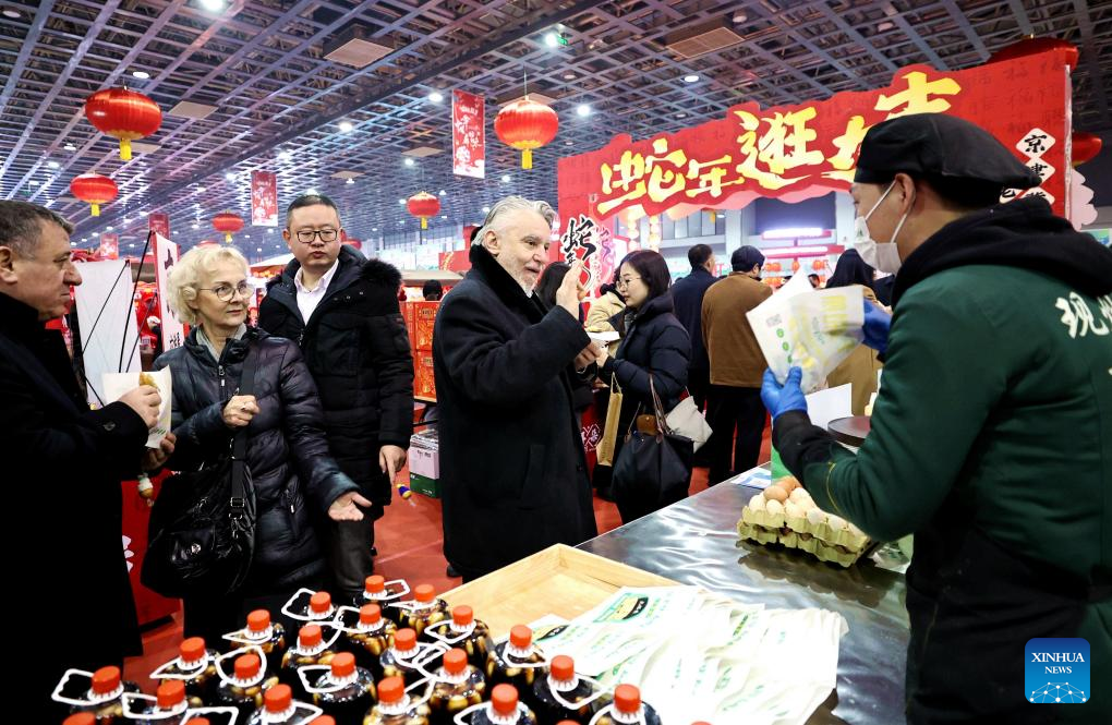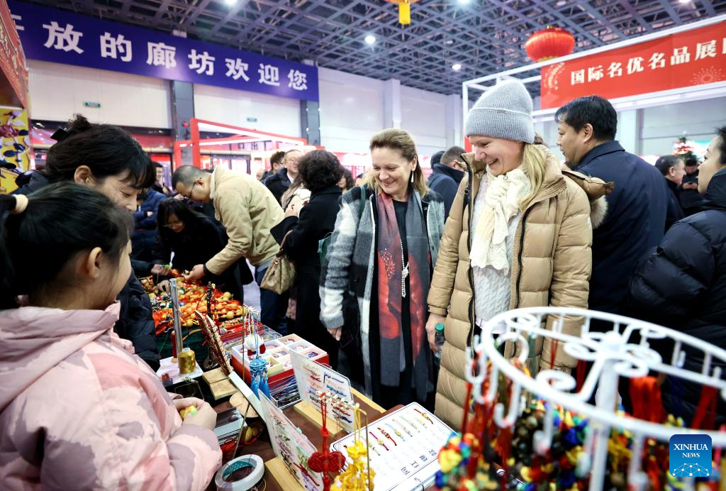 Members of the diplomatic corps select products at a festive event for the upcoming Chinese New Year, or the Spring Festival, in Langfang, north China's Hebei Province, Jan. 23, 2025. (Xinhua/Wang Xiao)