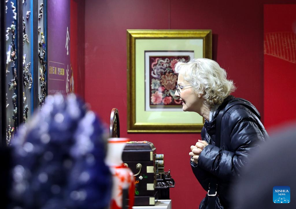 A member of the diplomatic corps watches artworks at a festive event for the upcoming Chinese New Year, or the Spring Festival, in Langfang, north China's Hebei Province, Jan. 23, 2025. (Xinhua/Wang Xiao)