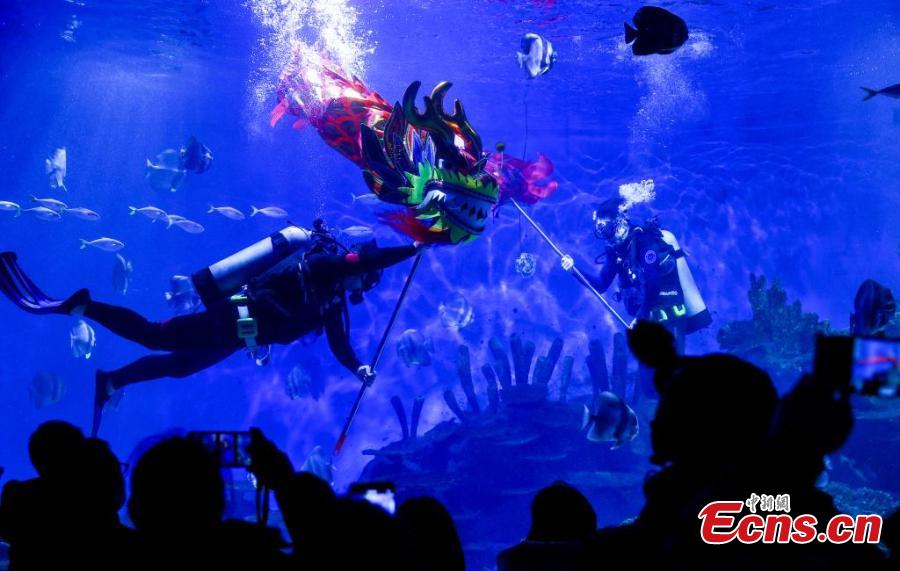 Tourists watch an underwater dragon dance performance at Wuhan Haichang Polar Ocean Park in central China's Hubei Province, Jan. 25, 2025. (China News Service/Zhang Chang)